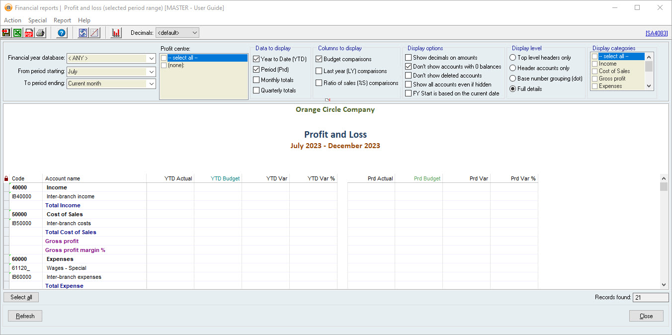 This option allows you to view accounts which have been hidden via unticking Display in the Financial reports on the Options tab of the account. This could be desired if, for example, the account is used for transactions but is not relevant to profit and loss analysis. This is negated when the Show all accounts even if hidden option is ticked.