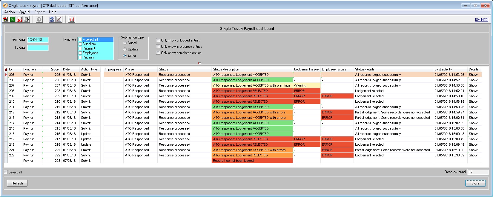 - ATO Response: lodgment REJECTED - The entire STP lodgment has been rejected by the ATO. Will be highlighted with this colour.